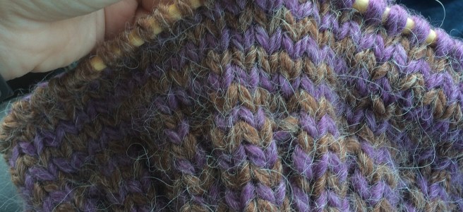 While I was in JoAnn’s, I decided to purchase everything I would need to make myself a nice warm winter set. I chose a super soft, Buttercream alpaca blend yarn in solid brown and purple. Because of the bulkiness of the yarn, I chose size 10.5 knitting needles in both circular and double point. I didn’t have any scissors with me and I always like to have something to cut the yarn with me in a project. Instead of purchasing another expensive pair of small scissors, I opted for a large seam ripper. I like using seam rippers because they are small, have protective lids over the blades, and cut yarn with ease. Oh, and they are cheap! I also decided to try one of their Snapware Yarn Containers for this project. This large plastic jar is big enough to hold all of my supplies for this project to keep it all clean while crafting on the go. The lid has a hole so I can have my yarn pulling from the center of the skeins to work with both colors without any tangling.