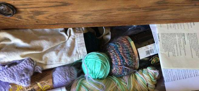 My craft area isn’t very large, and lacks storage. Most of my yarn stash lives in totes stacked against the wall. As I use my yarn in projects, I tend to leave the remains all around my house. Stuffing them into one over full dresser drawer in the craft room when I clean up.